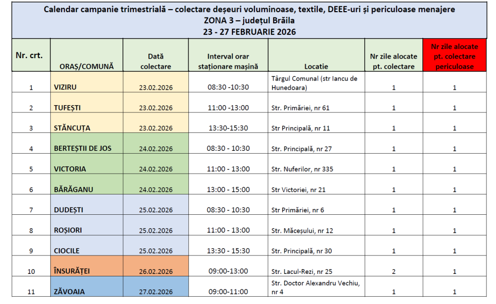 Prin prezenta vă comunicăm faptul că în perioada 23 – 27 februarie 2026 vom desfășura campania de colectare gratuită a deșeurilor voluminoase, textile, DEEE-uri și a celor periculoase menajere în localitățile din Zona 3 a județului Brăila.
